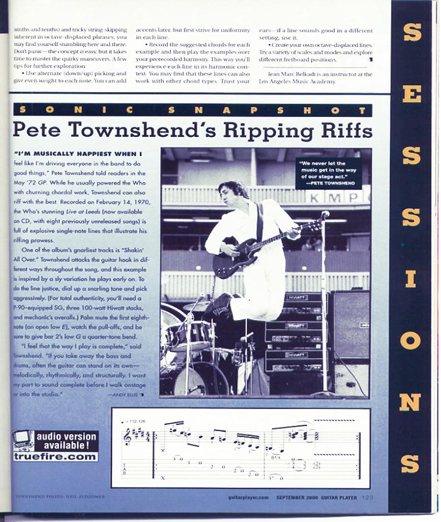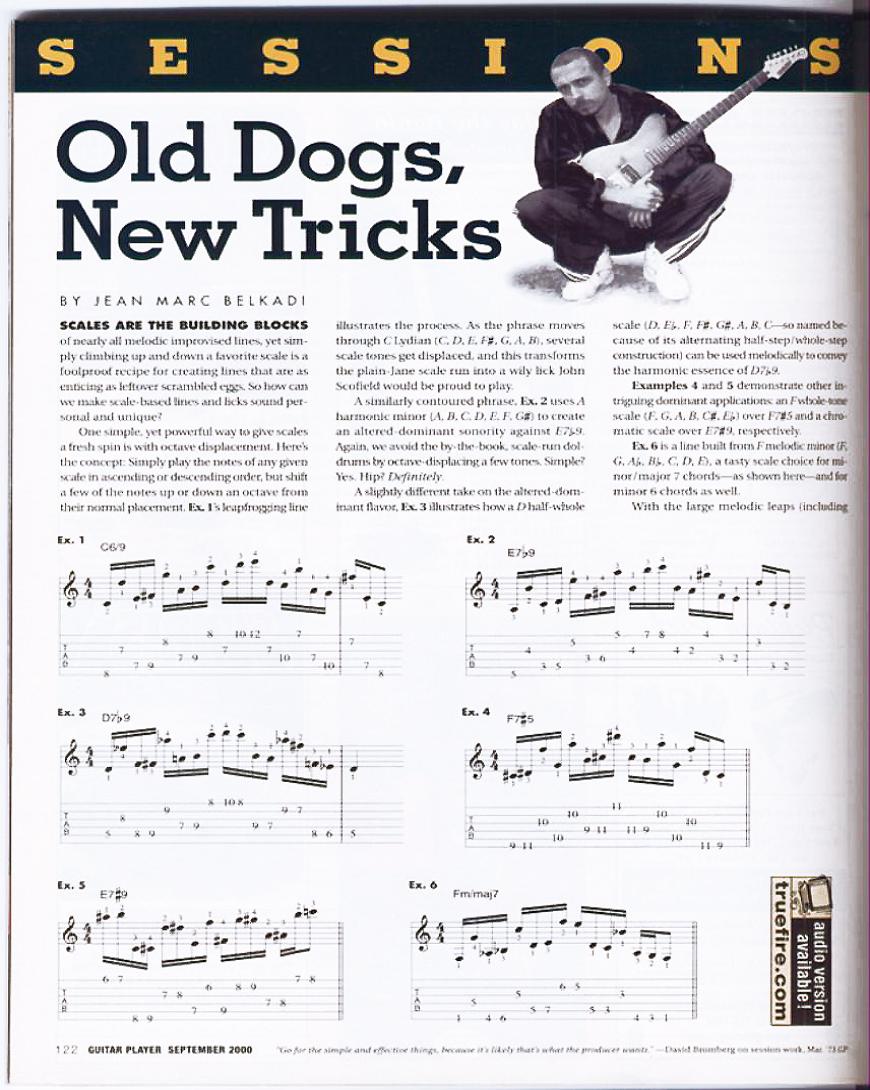 Scales are the building blocks of nearly all melodic improvised lines, yet simply climbing up and down a favorite scale is a foolproof recipe for creating lines that are as enticing as leftover scrambled eggs. So how can we make scale-base lines and licks sound personal and unique? One simple, yet powerful way to give scales a fresh spin is with octave displacement. Here’s the concept: Simply play the notes of any given scale in ascending or descending order, but shift a few of the notes up or down an octave from their normal placement. EX. 1’s leapfrogging line illustrates the process. As the phrase moves through C Lydian (C, D, E, F#, G, A, B) several scale tones get displaced, and this transforms the plain-Jane scale run into a wily lick John Scofield would be proud to play. A similar contoured phrase, Ex. 2 uses A harmonic minor (A, B, C, D, E, F, G#) to create an altered-dominant sonority against E7b9. Again, we avoid the by the book, scale-run doldrums by octave-displacing a few tones. Simple? Yes. Hip? Definitely. A slightly different take on the altered-dominant flavor, Ex. 3 illustrates how a D half-whole scale (D, Eb, F, F#, G#, A, B, C-- so named because of its alternating half-step/whole-step construction) can be used melodically to convey the harmonic essence of D7b9. Example 4 and 5 demonstrate other intriguing dominant applications: an F whole-tone scale (F, G, A, B, C#, Eb) over F7#5 and a chromatic scale over E7#9, respectively. Ex. 6 is a line built from F melodic minor (F, G, Ab, Bb, C, D, E) a tasty scale choice for minor/major 7 chords-as shown here-and for minor 6 chords as well. With the large melodic leaps (including ninths and tenth) and tricky string- skipping inherent in octave-displaced phrases, you may find yourself stumbling here and there. Don’t panic- the concept is easy, but it takes time to master the quirky maneuvers. A few tips for further exploration: - Use alternate (down/up) picking and give even weight to each note. You can add accents later, but first strive for uniformity in each line. - Record the suggested chords for each example and then play the examples over your prerecorded harmony. This way you’ll experience each line in its harmonic context. You may find that these lines can also work with other chord types. Trust your ears-if a line sounds good in a different setting, use it. Create your own octave-displaced lines. Try a variety of scales and modes and explore different fretboard positions. |