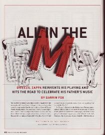 | Dweezil Zappa, sitting in the studio control room tucked inside the rustic confines of Zappa Family Headquarters, “he would say, 'Idon’t. It's not important'. Well, to me it is important. I want my kids, and my kid’s kids to feel as strongly as I do about my dad’s music, because it’s so unique. Especially living in a world where so much music sounds the same, there isn’t anything that sounds like Frank.” So Zappa—who enjoys the distinction of being immortalized with his dad on the cover of the January ’87 issue of GP (which also included a Soundpage)—decided he was going to do something to ensure his father’s work isn’t forgotten. In the process, he put himself in the hot seat as a guitarist. “I thought the best way to get people interested in Frank’s music was for them to see it performed live,” he says. “But the minute I decided to do the Zappa Plays Zappa tour, I knew my main challenge was to get my guitar skills together I had to play the really difficult, complex parts found in Frank’s music, as well as improvise solos in the context of that music. So that required rethinking how I play on not only a technical level, but a mental level, too, as I tried to incorporate the idiosyncrasies of his playing into my own playing.” So Zappa got to work, and gave himself, to use his term, “A Complete Guitar Makeover.” He then assembled a band of young, 20-something musicians, as well as three guest players who served time in his father’s band; Terry Bozzio, Napoleon Murphy Brock, and Steve Vai. “I feel that if I don’t do this, there’s a chance his music will slip into obscurity within my lifetime,” says Zappa. “Frank is truly one of the great American composers, and he gets major kudos and respect in the classical world, but that world is a lot different than the pop/rock world that can, and will, easily dismiss anything. I don’t want that.” You’ve said the ZPZ tour is an “official” representation of Frank’s music. What makes it official, and is the ZPZ tour in any way a reaction to other Zappa tribute bands? On a certain level it is a reaction to those outfits. Don’t get me wrong, I understand why people go out and play Frank’s music. And in some small way, they’re contributing to building an audience. But it’s not the same. I feel we’re official, because, well, I’m related, and I believe that makes me the most appropriate person to mount this project. I think my dedication will come across quite easily. What specifically bothers you when you hear other groups playing Frank’s music? I’ve heard a lot of different people do versions of Frank’s music, and I’ve never once heard one that made me say, “Wow, they got it right.” Not once. Believe me, if I did hear that, I’d be psyched. You know, “Who are these freaks who can do this?” The versions I hear are usually in the ballpark, but you’re not playing the music correctly if you’re putting your own stuff in there. That’s what I really don’t like. I know how hard it is to play Frank’s music, and I feel for anyone who is trying to do it. But if they’re going to do it, I want them to do it right, because if an audience hears a bad version of his music first, they may not give it a fair chance. That’s what ZPZ is all about getting people interested in exploring more of Frank’s music. You’ve put together a band of young, unknown players. Was this intentional? Yes. I feel Frank’s music is very contemporary, so I wanted to present it onstage in a way that a young person can embrace—and that means seeing someone around their age playing it. I think college-aged kids—and even younger— would be fascinated by this music. They just don’t know about it, because it seems that Frank’s music has skipped a couple of generations. Why is that? Much of it is due to the way the media has reported on him throughout his career. Some of it is also because the stuff of his that did make it on the radio—such as “Valley Girl”—really didn’t represent what he was about. Ask a person who doesn’t really know Frank’s work what song they’ve heard, and invariably it’s “Titties & Beer,” or maybe “Don’t Eat the Yellow Snow.” Sure, those songs represent his sense of humor, but he’s not Weird Al Yankovic. He’s a bonafide brilliant composer whose music will stand the test of time. I want people to become more familiar with that aspect, rather than what may have made its way to the public consciousness by accident. Another reason I feel his music has been overlooked by younger generations is because of the high level of musicianship it takes to play it. Years ago, musicians would aspire to that level. Now, a lot of musicians worry more about achieving the right look, and hoping the label’s clever marketing can put them over the top. There hasn’t been an emphasis anywhere that I’ve seen on finding the best musicians out there, and then giving them an opportunity to play. Maybe in a jazz context, but strictly jazz. But Frank blended so many styles together—and there was so much going on musically —that once you’re exposed to it, you’re so disappointed that no one else is even trying to do something like that. Who is writing music this hard? And it’s not hard for the sake of being hard. It’s very musical and memorable and cleverly arranged. It’s not an exercise. That’s another reason why I feel younger fans will be inspired by this music, because they may not know there’s a reason to go out and be that good on your instrument Was it hard finding young guys who could play Frank’s more difficult stuff? Yeah. I wasn’t sure I was going to be able to find them, but I did. The spirit of the band is amazing. It’s almost like we’re training for the Olympics. It’s difficult music that requires many of the band members to be wellversed in jazz, rock, and classical music, as well as having big enough ears to wra